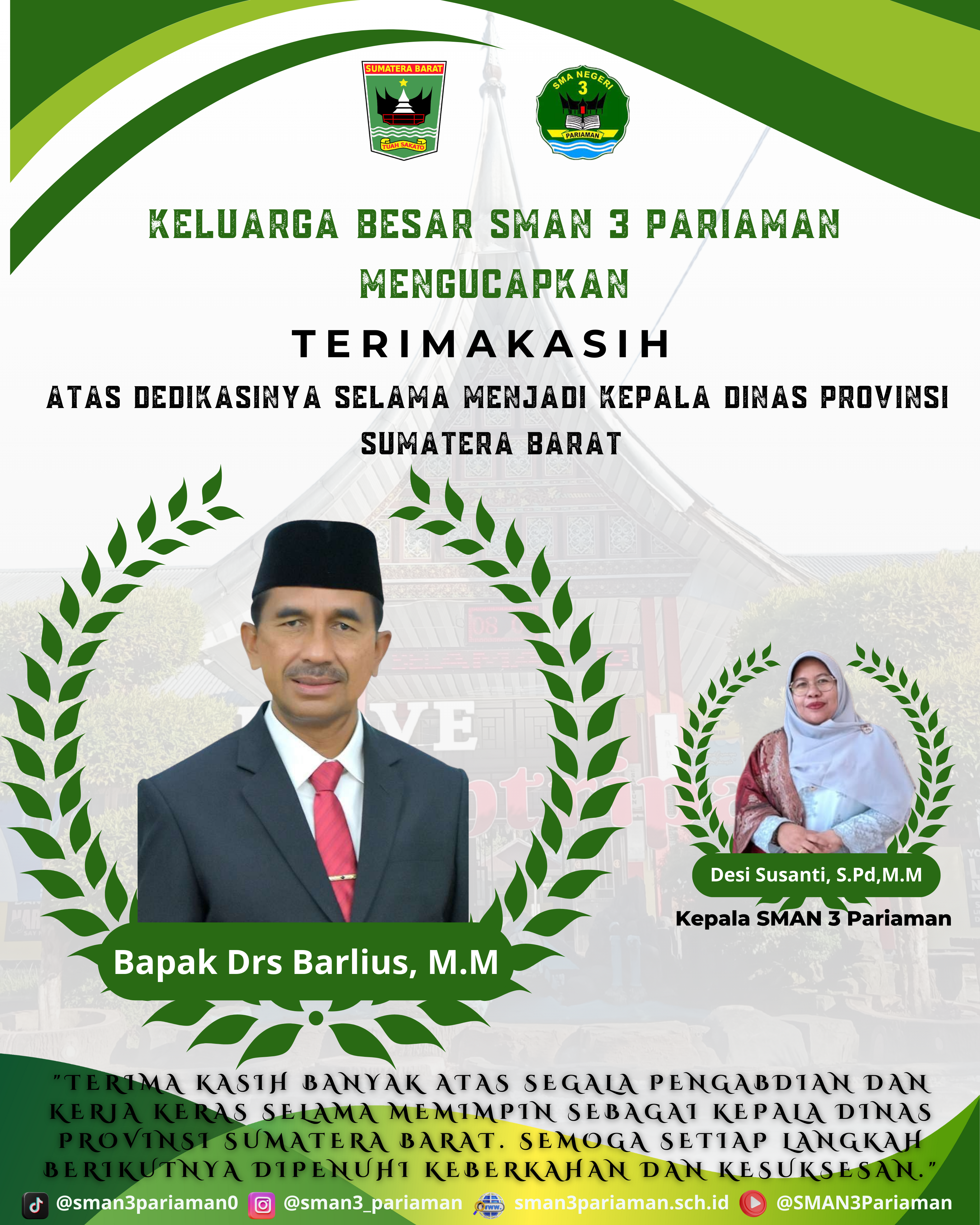Ucapan Terima Kasih atas Dedikasi Bapak Drs. Barlius, M.M sebagai Kepala Dinas Pendidikan Provinsi Sumatera Barat Sabtu, 23 Agustus 2025 – Keluarga besar SMAN 3 Pariaman dengan penuh rasa hormat ...
